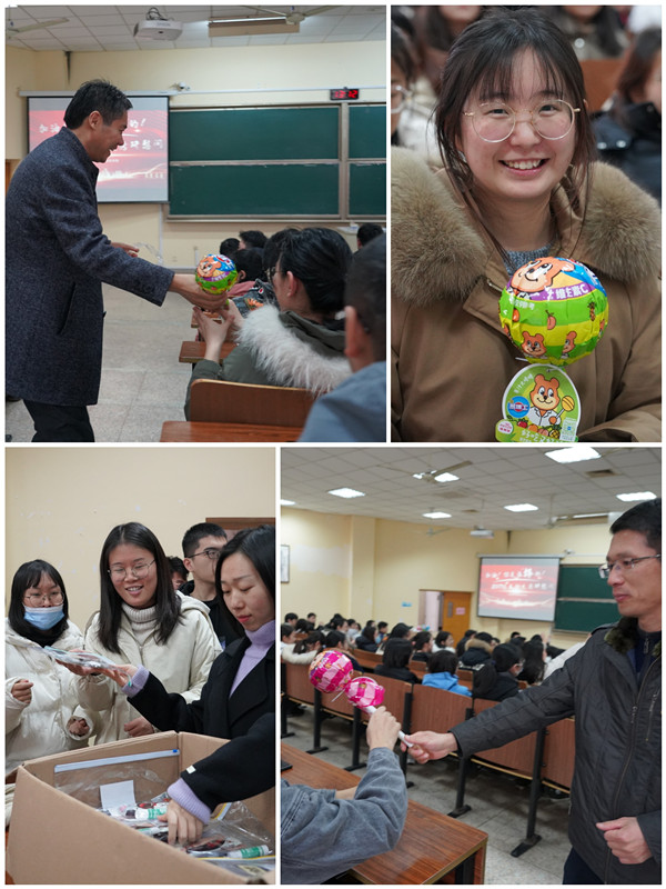 首先,陳海群對正在備戰(zhàn)考研的學子們表達了慰問、鼓勵、期望之情:希望同學們保持樂觀的心態(tài)、注意身體健康、明確考研目標、積極備戰(zhàn)考研。接著,吳荷平叮囑大家平衡好考研壓力,把生活、學習規(guī)律調(diào)整到位,全力沖刺,發(fā)揮出自己最好的水平。而后,繆老師通過“青春是用來拼搏的,夢想是用來實現(xiàn)的,圓夢考研你們是最棒的!”來鼓勵大家考研加油。院領(lǐng)導(dǎo)表示學院是所有考研同學的堅強后盾,會努力為大家提供良好的考研條件,并祝愿大家金榜題名,考上理想院校。最后,學院還為考研學子們發(fā)放了“最棒”棒棒糖、“考霸”文具袋,希望同學們堅定信念,全力沖刺,蟾宮折桂,舍我其誰!