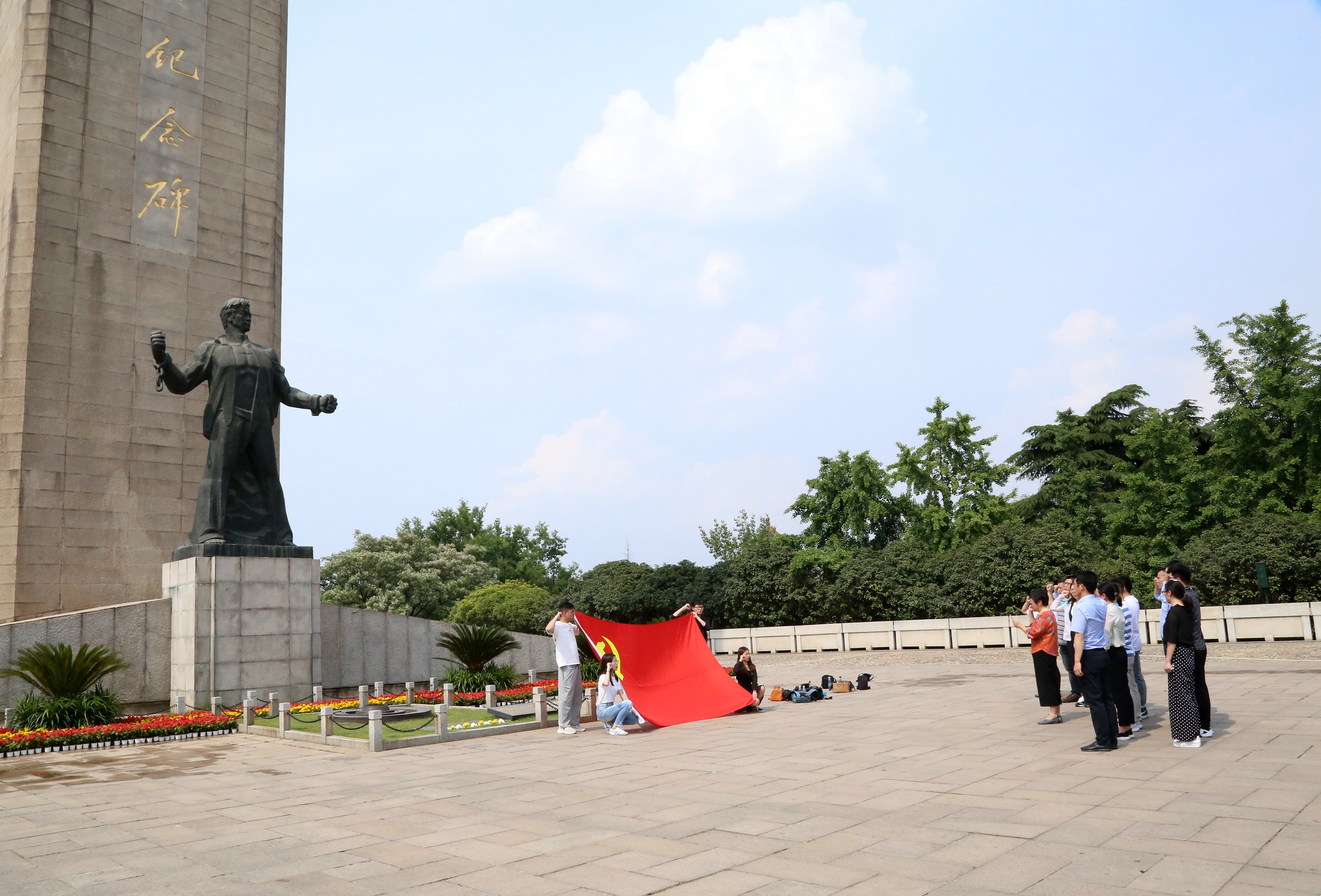 在雨花臺烈士陵園紀(jì)念碑前,由退休教師黨員尹芳華老師領(lǐng)誓,師生黨員以鏗鏘有力的聲音,面向黨旗重溫入黨誓詞,表達(dá)“不忘初心、牢記使命”的信念和決心。