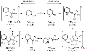 由于2-吡啶酮在溶液中有吡啶酮和羥基吡啶兩種形式存在,為兩可親核試劑,即既有氧親核性也有氮親核性,且由于氧的電負(fù)性較大,此前的吡啶酮卡賓插入反應(yīng)也以O(shè)-H鍵插入為主。我們通過計(jì)算揭示了此反應(yīng)的極高的氮選擇性反應(yīng)機(jī)理。