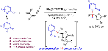 在前期工作基礎(chǔ)上,孫江濤課題組和北京大學(xué)深圳研究院的張欣豪課題組合作,以烯炔酮為卡賓前體,吡啶酮為親核試劑,實(shí)現(xiàn)了呋喃卡賓的N-H鍵插入反應(yīng)。也是第一次實(shí)現(xiàn)了給體卡賓的N-H鍵插入反應(yīng),通過計(jì)算揭示了全新的不對(duì)稱1,4-質(zhì)子轉(zhuǎn)移機(jī)理。