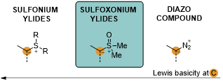 锍葉立德作為兩性離子化合物,一般需要在葉立德Cα-位引入吸電子基來穩(wěn)定其存在。此外,根據(jù)硫原子氧化態(tài)的不同,可以分為sulfonium ylide(正锍葉立德)與sulfoxonium ylide(氧化锍葉立德)兩大類。電負(fù)性氧原子的引入,不僅使得氧化锍葉立德的葉立德碳Lewis堿性降低,而且具Lewis堿性的氧原子或副產(chǎn)物DMSO容易與手性催化劑結(jié)合,從而可能對反應(yīng)過程中的手性誘導(dǎo)產(chǎn)生干擾。但與正锍葉立德以及類似的重氮化合物相比,氧化锍葉立德具有良好的穩(wěn)定性,之前報道的絕大多數(shù)文獻(xiàn)都將其作為重氮化合物的替代物經(jīng)金屬卡賓中間體應(yīng)用于有機(jī)合成。因此,發(fā)展基于锍葉立德不對稱催化研究具有重要意義。