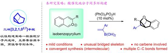 近日,黃海教授與孫建偉教授課題組在Angew. Chem. Int. Ed.上發(fā)表題為“A Mild Intermolecular Synthesis ofCyclopropane-Incorporated Tricyclic Skeleton: Unusual Reactivity of Isobenzopyryliums”的研究論文。復(fù)雜的結(jié)構(gòu)骨架,特別是帶有張力小環(huán)的骨架結(jié)構(gòu)是天然產(chǎn)物較為多見的母體結(jié)構(gòu),但是由于結(jié)構(gòu)的復(fù)雜性和不穩(wěn)定性,這一類骨架的構(gòu)建一直以來是具有挑戰(zhàn)性的工作。例如,三環(huán)[3,2,1,02,7]辛烷就是這樣一類復(fù)雜又帶有張力小環(huán)的骨架結(jié)構(gòu),以往的構(gòu)建策略都需要涉及金屬卡賓、高溫等苛刻反應(yīng)條件來克服動力學(xué)或熱力學(xué)不利的問題。本論文實現(xiàn)了一種在普通酸催化下的苯并異吡喃鹽與烯基硼酸連續(xù)[4+2]環(huán)加成/關(guān)環(huán)反應(yīng),成功構(gòu)建了氧雜三環(huán)[3,2,1,02,7]辛烷骨架結(jié)構(gòu)。該類結(jié)構(gòu)預(yù)計在藥物分子中具有潛在的應(yīng)用價值。同時,后期合成應(yīng)用顯示,目標分子具有很高的合成價值,是一類不可或缺的骨架結(jié)構(gòu)。