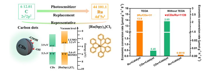 課題組基于MOFs材料構(gòu)建“多核殼催化劑”,由ZIF-67@MIL-68(In)誘導(dǎo)生成CDs/Co3O4/In2O3納米管。研究發(fā)現(xiàn),CDs(碳點)基催化劑在不添加犧牲劑TEOA(三乙醇胺)的條件下,光催化CO2還原性能優(yōu)于吡啶釕基催化劑。在這一體系中,碳點可以有效替代貴金屬催化劑取得良好的光催化性能。此項研究得到了江蘇省優(yōu)秀青年基金,國家自然科學(xué)基金的支持。