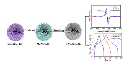 近年來,過渡金屬氧化物以其可變的氧化價態(tài),成本低廉,易于制備而引起廣泛關注。此外,鑒于過渡金屬氧化物的理論比電容較高且電活性較好,故而在儲能領域具有重要地位。在本工作中,課題組提出了一種雙缺陷工藝構建富含氧空位和Mo摻雜的NiCo2O4(R-Mo-NiCo2O4)。通過NaBH4還原在NiCo2O4晶格中產生氧空位缺陷,在材料中產生更多的載流子,使更多活性物質參與電化學氧化還原反應過程。此外,氧空位和Mo摻雜的協(xié)同作用不僅提高了材料的導電性,而且豐富了氧化還原動力學。將通過氧空位和Mo摻雜雙缺陷工藝制備得到的R-Mo-NiCo2O4用做超級電容器電極,在電流密度1 A g?1下比容量高達285.8 mAh g?1,且具有較好的倍率性能及循環(huán)穩(wěn)定性。該電極材料優(yōu)異的性能可歸因于R-Mo-NiCo2O4較大的比表面積可增加其與電解質的接觸面積,實現(xiàn)電解質充分擴散的同時縮短了電荷轉移的擴散路徑;Mo元素的引入促進了電荷轉移,提高了R-Mo-NiCo2O4的導電性,同時Mo元素的引入有助于形成氧空位缺陷,促進離子在電極中的擴散;經NaBH4還原后,氧空位缺陷的數(shù)量可進一步增加,提升了該電極材料的電化學性能。該成果于近日發(fā)表于化學領域著名期刊Chemical Communications (2022, 58, 5120–5123)。