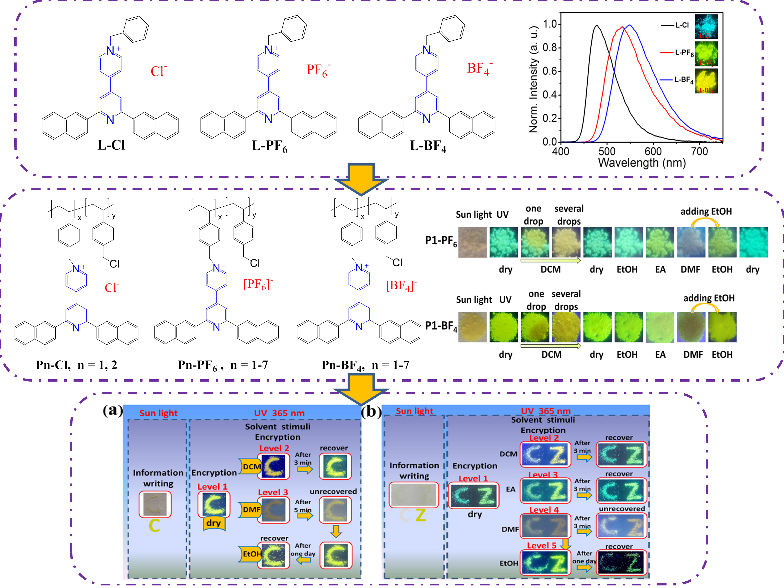 智能熒光材料,在外界刺激調(diào)節(jié)作用下,可呈現(xiàn)多種不同發(fā)光顏色,或是不同強度的發(fā)光,在高級光學(xué)防偽領(lǐng)域具有巨大應(yīng)用潛能,吸引了大量研究者廣泛研究。目前,盡管有一些新穎的多色可調(diào)光學(xué)材料,如無機材料,量子點,金屬有機框架聚合物,高分子聚合物等,被相繼開發(fā)應(yīng)用。但是,所報道的很大部分相關(guān)多色發(fā)光材料,合成較復(fù)雜,光學(xué)可逆性差,往往僅呈現(xiàn)兩種可調(diào)的發(fā)光顏色,在高階光學(xué)防偽實際應(yīng)用方面仍有一定局限。為實現(xiàn)高階光學(xué)防偽的實際應(yīng)用,仍需進一步發(fā)展簡單的兼具高效發(fā)光、高對比度、優(yōu)異可逆性、多色發(fā)光(超過三種發(fā)光顏色)的動態(tài)智能發(fā)光材料,但這極具挑戰(zhàn)性。