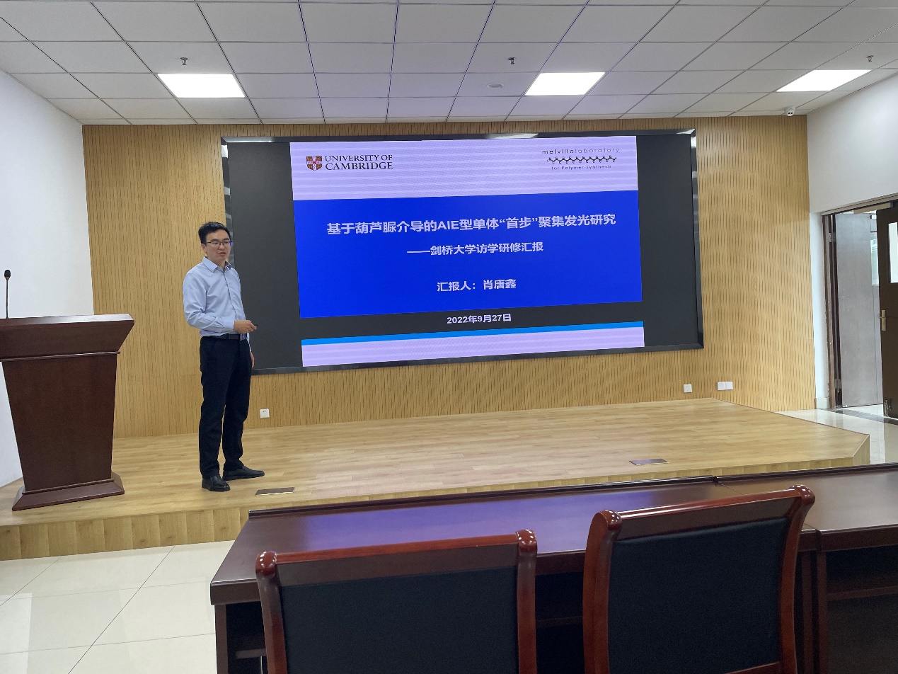 肖唐鑫老師作了“葫蘆脲介導(dǎo)的AIE型單體首步聚集發(fā)光研究”的報(bào)告,他于2021年3月-2022年6月受?chē)?guó)家留學(xué)基金委資助赴英國(guó)劍橋大學(xué)化學(xué)系研修。在報(bào)告中,肖老師介紹了訪學(xué)的申請(qǐng)過(guò)程、訪問(wèn)期間的學(xué)術(shù)研究?jī)?nèi)容,還和大家分享了在劍橋的見(jiàn)聞。