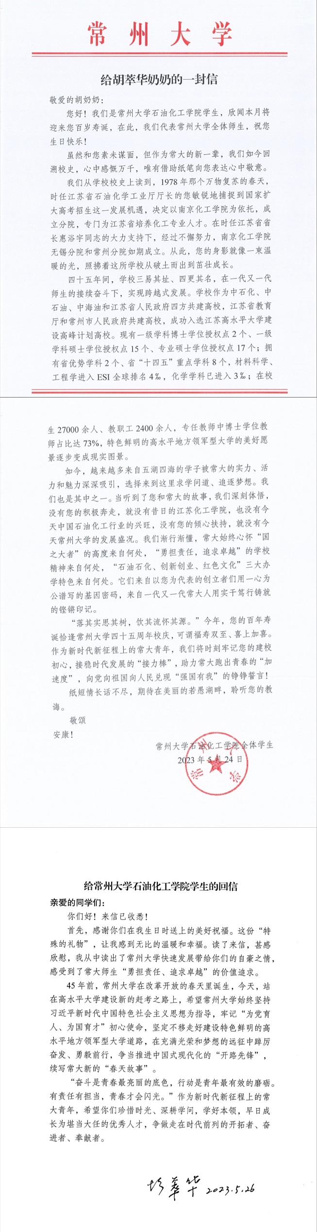 胡老高興地回憶起壽誕前夕與常大學(xué)子通信的故事。不久前,石油化工學(xué)院學(xué)生得知,他們?nèi)f分敬仰的胡萃華奶奶即將迎來(lái)百歲壽誕。為了表達(dá)心中敬意,同學(xué)們給胡奶奶寫了一封信,信中匯報(bào)了學(xué)校發(fā)展變化的情況和他們奮發(fā)學(xué)習(xí)的志向。胡奶奶很快就回了信,在信中不僅高度肯定了學(xué)校45年來(lái)的跨越式發(fā)展,還寄語(yǔ)常大學(xué)子,希望同學(xué)們珍惜時(shí)光、深耕學(xué)問、學(xué)好本領(lǐng),早日成長(zhǎng)為堪當(dāng)大任的優(yōu)秀人才,爭(zhēng)做走在時(shí)代前列的開拓者、奮進(jìn)者、奉獻(xiàn)者。