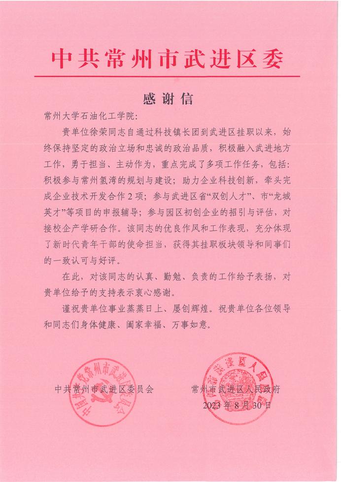 近日,我院收到來自中共常州市武進區(qū)委的感謝信。信中對我院徐榮同志在武進區(qū)掛職工作過程中,勇于擔當、主動作為、認真勤勉的工作作風,以及善于溝通協調、專業(yè)技能過硬的綜合能力,予以認可和表揚,并致以衷心的感謝。