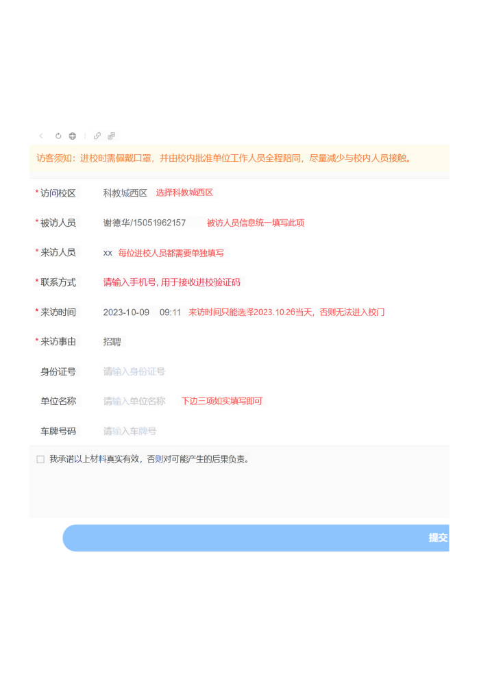 ③信息填寫完畢后點擊提交,審核通過后將收到預約信息登記成功短信并附帶入校鏈接,入校時請點擊鏈接生成入校二維碼并向門衛(wèi)出示即可。