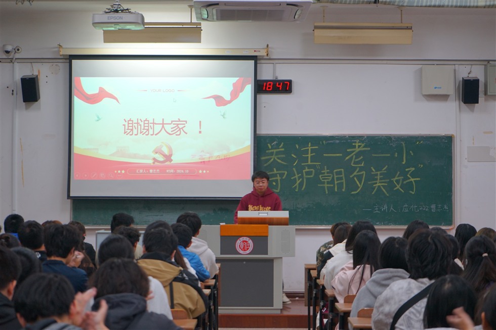 為提升大學(xué)生對(duì)老年人和兒童的關(guān)注與關(guān)愛(ài),培養(yǎng)社會(huì)責(zé)任感,共同構(gòu)建和諧美好的社會(huì)環(huán)境,我院于10月29日在W1210教室開(kāi)展了“青年講師團(tuán)”系列講座第二講——關(guān)注“一老一小”,守護(hù)“朝夕美好”。本次活動(dòng)由學(xué)生第二黨支部黨員應(yīng)化222曹志杰主講,我院學(xué)生代表參加。