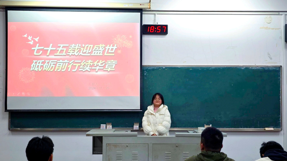 為傳承紅色文化,發(fā)揚紅色精神,我院于1月26日在W1209教室開展了“青年講師團”系列講座第四講——歲月見證輝煌路,七十五載展華章。本次講座由學生第二黨支部黨員能化221汪子鈴主講,我院學生代表參加。