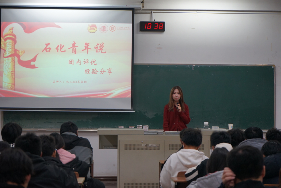 為使同學(xué)們深入了解團(tuán)內(nèi)評(píng)優(yōu)機(jī)制、提高其綜合素質(zhì)和能力,我院于12月3日在W1205教室開展“石化青年說”系列講座第四講——團(tuán)內(nèi)評(píng)優(yōu)經(jīng)驗(yàn)分享。此次講座由化工233吳雨桐、應(yīng)化231郭怡溪主講,我院學(xué)生代表參加。