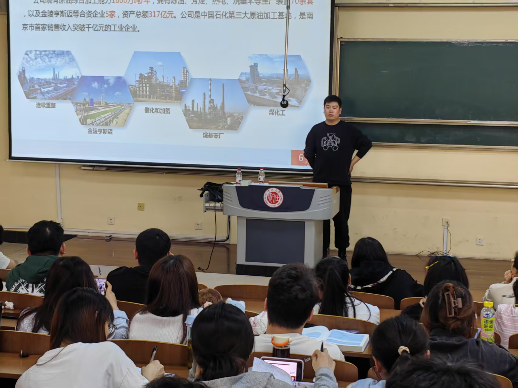 講座中,王峰以金陵石化為例,系統(tǒng)介紹了石油石化企業(yè)的主要工作內(nèi)容、工作環(huán)境、福利待遇及晉升途徑。他并結(jié)合自身職業(yè)成長經(jīng)歷,為學(xué)弟學(xué)妹勾勒出清晰的進(jìn)階路線:從校園招聘入職煉化操作崗起步,自己通過輪崗學(xué)習(xí)生產(chǎn)工藝、考取中級(jí)工程師職稱,逐步轉(zhuǎn)入技術(shù)部,成為技術(shù)骨干。他建議學(xué)生分階段制定目標(biāo):在校期間夯實(shí)專業(yè)基礎(chǔ),入職初期專注技能積累,中期瞄準(zhǔn)技術(shù)攻關(guān)或管理能力提升,長期深耕新能源領(lǐng)域或向綜合管理崗位轉(zhuǎn)型。