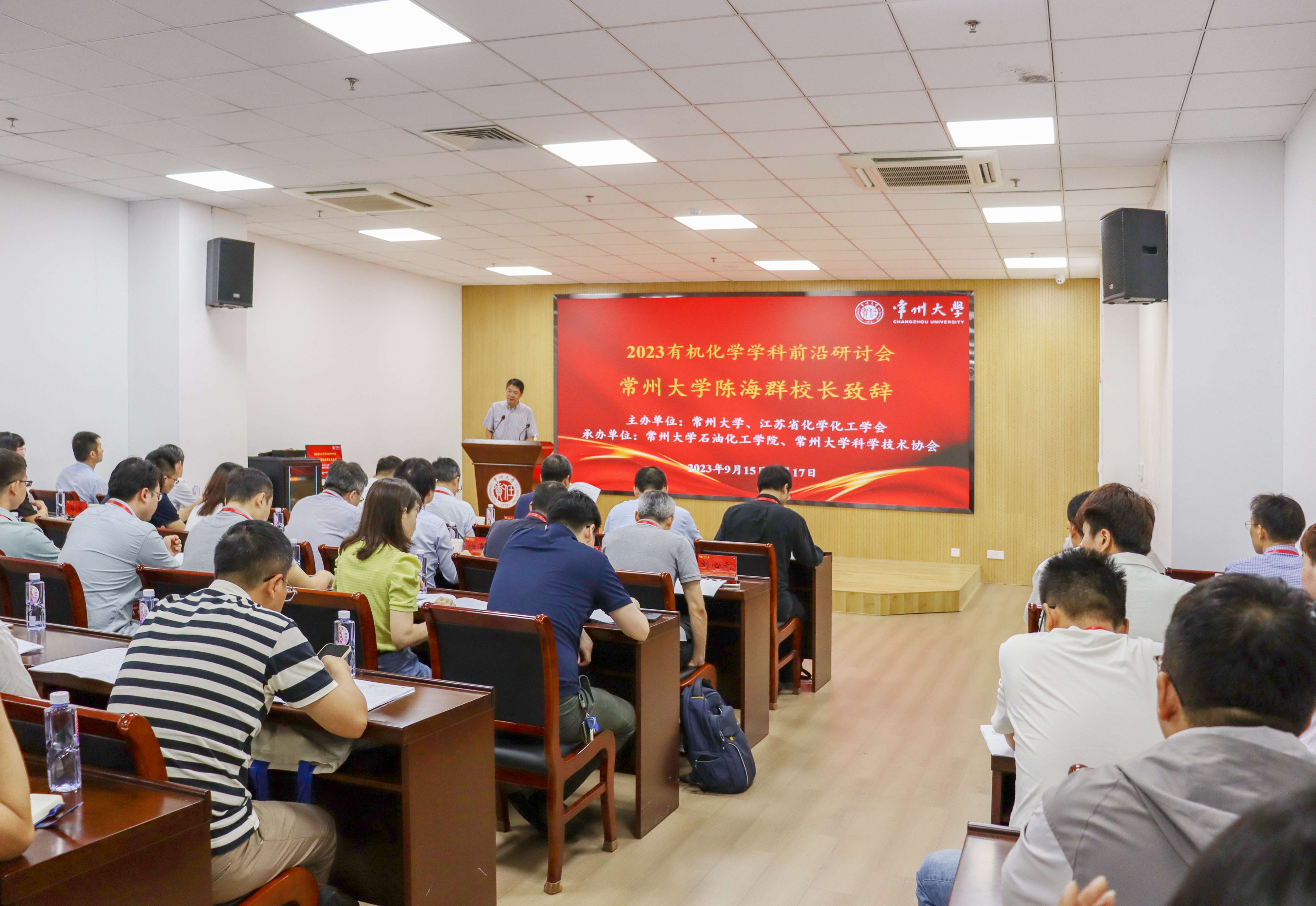 陳海群致歡迎辭,他介紹了常州大學(xué)的發(fā)展概況,并重點(diǎn)介紹了常州大學(xué)有機(jī)化學(xué)學(xué)科的發(fā)展情況和師資隊(duì)伍建設(shè),希望與會(huì)專家能為常州大學(xué)的有機(jī)化學(xué)學(xué)科建設(shè)發(fā)展提出寶貴意見和建議。