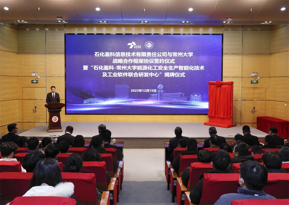 12月15日,石化盈科信息技術(shù)有限責(zé)任公司(以下簡(jiǎn)稱“石化盈科”)與常州大學(xué)戰(zhàn)略合作框架協(xié)議簽約儀式暨“石化盈科-常州大學(xué)能源化工安全生產(chǎn)智能化技術(shù)及工業(yè)軟件聯(lián)合研發(fā)中心”(以下簡(jiǎn)稱“聯(lián)合研發(fā)中心”)揭牌儀式在常州大學(xué)科教城校區(qū)文彰樓報(bào)告廳舉行。石化盈科董事長(zhǎng)、黨委書記周昌,黨委委員、副總裁張劉軍,常州大學(xué)黨委書記徐守坤,原黨委書記陳群,黨委副書記、校長(zhǎng)陳海群,副校長(zhǎng)晏成林出席活動(dòng)。石化盈科人力資源部、企改法律部、華東區(qū)域分公司、科技信息部、過程控制事業(yè)部,常州大學(xué)相關(guān)職能部門和學(xué)院負(fù)責(zé)人、教師和學(xué)生代表參加活動(dòng)。陳海群主持活動(dòng)。