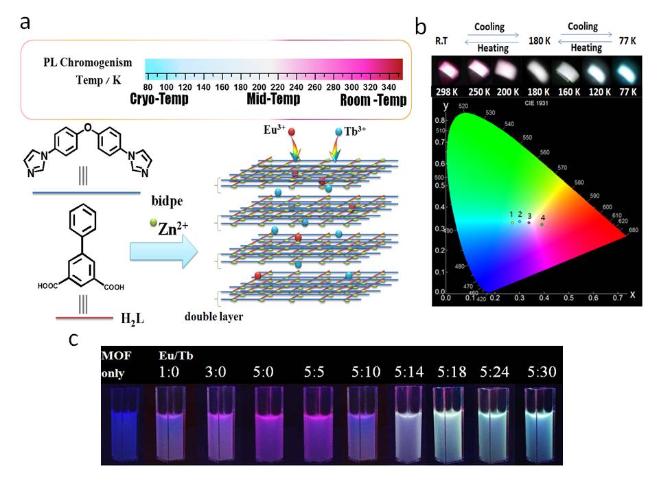 Tuning the Solid-State White Light Emission of Postsynthetic Lanthanide-Encapsulated Double-Layer MOFs for Three-Color Luminescent Thermometry Applications Liya Qiu?, Chengfeng Yu?, Xiaoling Wang?, Yangbin Xie?, Alexander M. Kirillov?§, Wei Huang*?, Jipeng Li?, Peng Gao?, Ting Wu?, Xiangwei Gu?, Qi Nie?, and Dayu Wu*? ? Jiangsu Key Laboratory of Advanced Catalytic Materials and Technology, Advanced Catalysis and Green Manufacturing Collaborative Innovation Center, School of Petrochemical Engineering, Changzhou University, Changzhou, Jiangsu213164, People’s Republic of China. ? Centro de Quimica Estrutural, Instituto Superior Tecnico, Universidade de Lisboa, Av. Rovisco Pais, 1049-001 Lisbon, Portugal. § Peoples’ Friendship University of Russia (RUDN University), 6 Miklukho-Maklayast., Moscow 117198, Russian Federation. 近日,吳大雨課題組通過后修飾方法成功合成了一例稀土嵌入二維雙層金屬有機框架(MOF)晶態(tài)材料,通過精準調(diào)控稀土離子的摻雜比例,實現(xiàn)了MOF材料的全彩色指紋發(fā)光。這類二維材料展現(xiàn)出優(yōu)良的溫度傳感功能,對溫度變化反應(yīng)靈敏、可逆切換。有望應(yīng)用在寬溫區(qū)(幾K到670 K)以及極端環(huán)境下的溫度計領(lǐng)域。 原文鏈接:https://pubs.acs.org.ccindex.cn/doi/pdf/10.1021/acs.inorgchem.9b00084.
